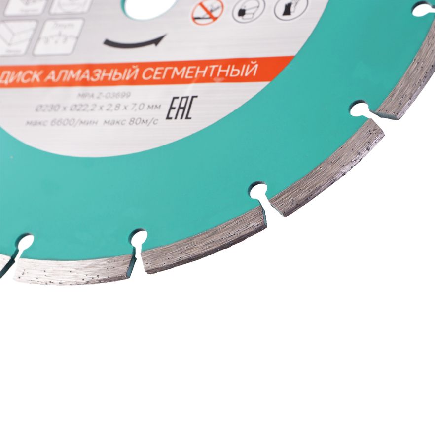 Режущая кромка с оптимальным содержанием алмазного слоя обеспечивает эффективную работу и низкую износостойкость; промежутки между сегментами способствуют лучшему охлаждению и выбросу пыли; тело диска, изготовленное из стали марки 65Г обеспечивает