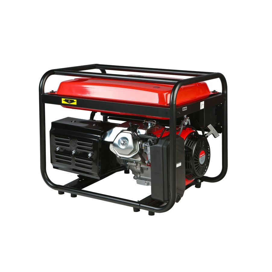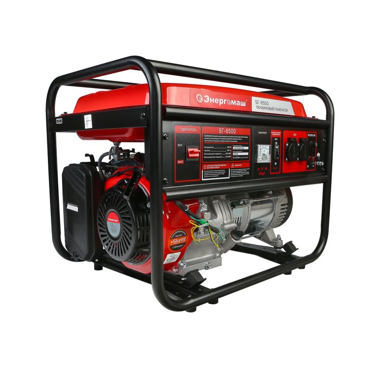 БГ-6500 – универсальный однофазный бензиновый генератор. Максимальная мощность –6.5 кВА. Номинальная мощность – 6.0 кВА. Отлично подойдет для резервного электроснабжения загородного дома или организации удаленной рабочей площадки. Имеет классическую компоновку: двигатель и альтернатор смонтированы внутри прочной усиленной трубчатой рамы, страхующей узлы генератора и бензобак от случайных повреждений, при транспортировке. Модель оснащается четырехтактным бензиновым двигателем 190F с верхним расположением клапанов (OHV) и воздушным охлаждением. Тип альтернатора – синхронный, с щеточно-коллекторным узлом. Синхронный альтернатор способен легко переносить индуктивные нагрузки и позволяет запитывать даже достаточно мощный строительный электроинструмент. За автоматическую стабилизацию выходного напряжения отвечает встроенная система AVR (Automatic Voltage Regulation). Панель управления оснащена контрольным аналоговым вольтметром, а также двумя пылезащищенными розетками переменного тока 220В на 16А с автоматическими подпружиненными крышками. Предусмотрена система поддержания энергобезопасности, принудительно отключающая агрегат при превышении допустимой нагрузки или коротком замыкании, а также система аварийной остановки двигателя при критически низком уровне масла. Запуск генератора осуществляется посредством ручного стартера. Назначение: для обеспечения аварийного питания при нестабильном электроснабжении с частыми и длительными отключениями, либо при его полном отсутствии.