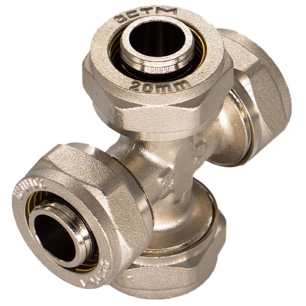 Крестовина 20х20х20х20 CTM равнопроходной обжимной фитинг для соединения металлопластиковых (металлополимерных) труб. Использование равнопроходной крестовины снижает давление потока в узле соединения при подключении дополнительных потребителей. Изготовлена методом горячей штамповки из латуни с последующей термической обработкой и никелированием для предотвращения появления коррозии, механического износа и вредного воздействия агрессивных жидкостей и воздушно-газовых сред. Корпус, накидная гайка и обжимное кольцо крестовины изготовлены из латуни, уплотнительное кольцо из нетоксичной резины (EPDM), и диэлектрическая прокладка из фторопласта Ф4 Накидная гайка – усиленная.