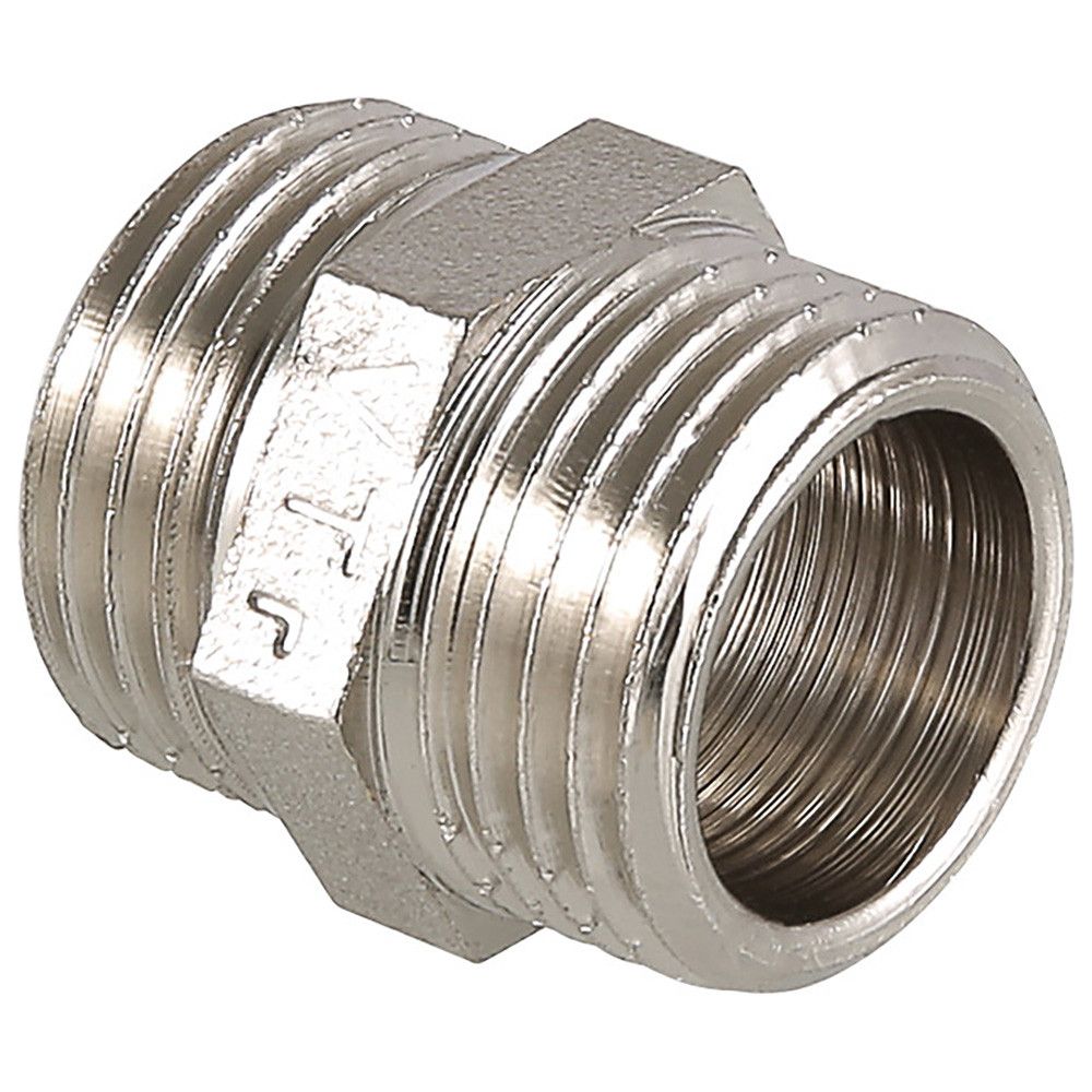 Латунный никелированный фитинг для соединения элементов трубопровода равного диаметра. Резьба – наружная/наружная, цилиндрическая трубная по ГОСТу 6357 (ISO 228, EN 10226). Предусмотрен участок корпуса шестигранной формы, под гаечный ключ.
