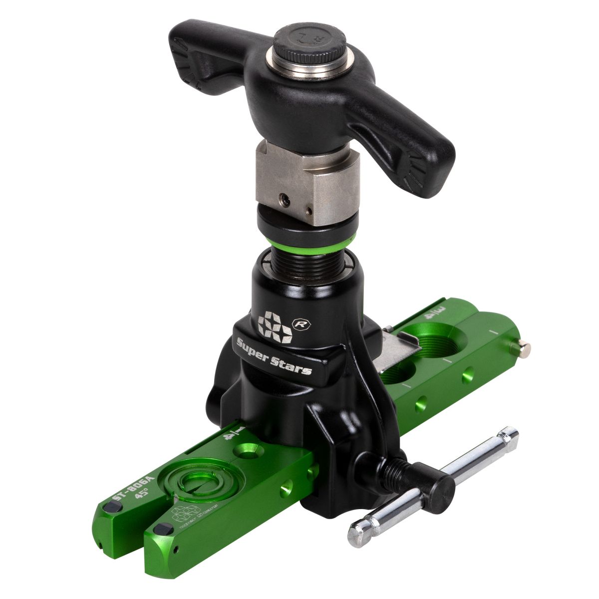 Универсальная развальцовка с трещоткой (храповым механизмом) и эксцентриковым конусом, изготовлена из аэрокосмического алюминия, предназначена для работы с дюймовымимедными трубами диаметром: 1/4", 5/16", 3/8", 1/2", 5/8", 3/4"