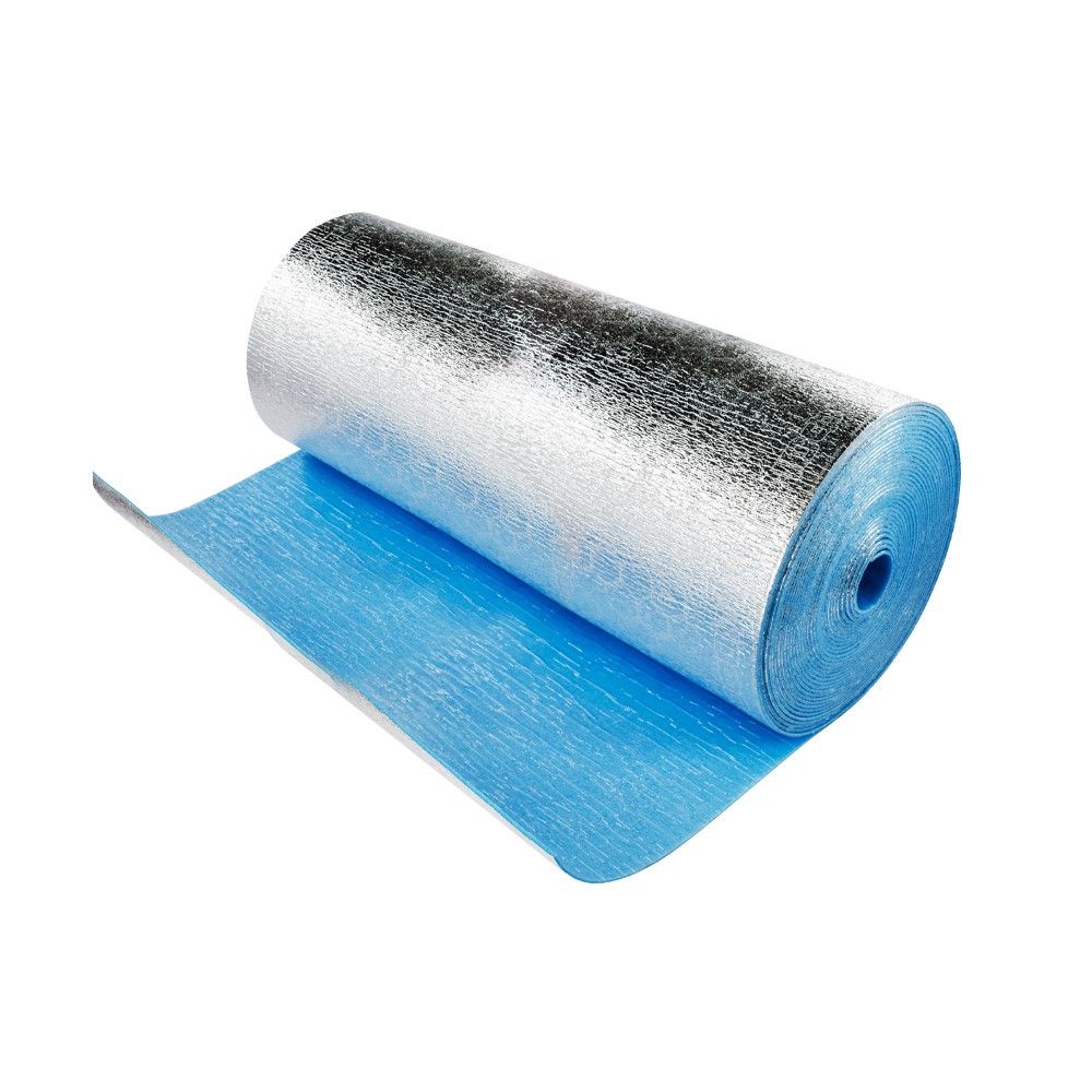 Самоклеящийся материал на основе вспененного полиэтилена, голубого цвета, с закрытой ячеистой структурой, дублированный алюминиевой фольгой и закрытым клеевым слоем с другой.