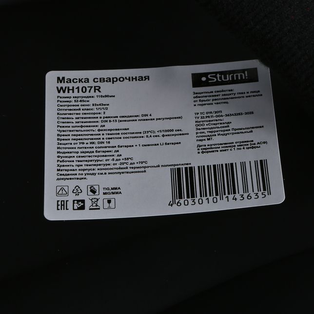Маска сварщика Sturm! WH107R, оснащённая автоматическим светофильтром высокого качества с классом защиты 1/1/1/2, гарантирует максимальную защиту глаз и лица от ультрафиолетового излучения, инфракрасного света и ярких вспышек дуги при сварке в режимах MMA, MIG-MAG , Plasma. Маска со сбалансированным набором опций. Имеется возможность смены элемента питания, режим шлифовки, регулировки затемнения и чувствительности. Возможность установки диоптрических линз. 3-х осевой наголовник с храповым механизмом и 5 регулировками. Сменный гипоалергенный резиновым затылочным обтюратором.