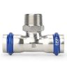 Тройник с наружной резьбой Varmega Inox Press с двух сторон имеет раструбное соединение для труб, а с другой стороны фитинга находится наружное резьбовое соединение. Данный фитинг позволяет присоединить к трубопроводу различные резьбовые элементы (краны, фильтры и т. п.), также дает возможность подключиться к другому типу трубопровода. Для получения надежного неразъемного соединения трубы и фитинга потребуется специальный пресс-инструмент с насадками типа профиль «V».