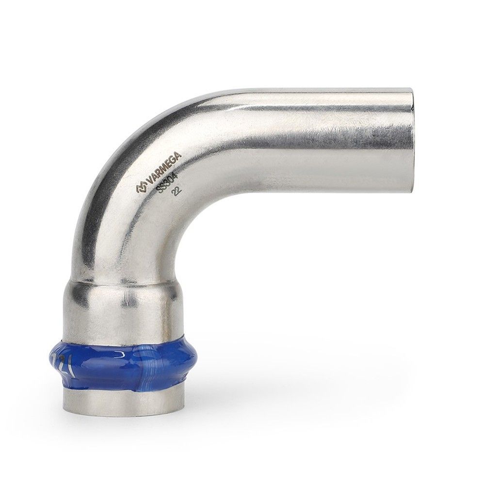 Угольник 90° однораструбный Varmega Inox Press используется для соединения труб и фитингов равных диаметров под углом 90 градусов. Для получения надежного неразъемного соединения трубы и фитинга потребуется специальный пресс-инструмент с насадками типа профиль «V».